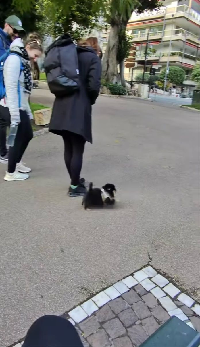 おさんぽ中に出会った人たちの足元に駆け寄る社交的な子犬。 その愛らしさで、みんなを笑顔にしてしまいます!