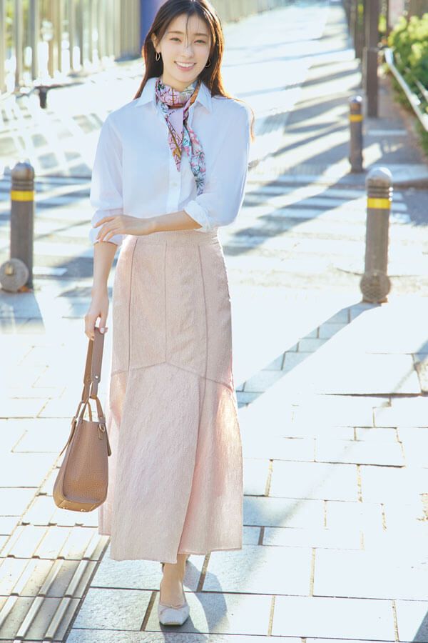 パウダーピンクのスカートは、繊細な総レースも魅力。華やかな柄スカーフが映える白シャツとの、春爛漫な色合わせに心躍らせて。
