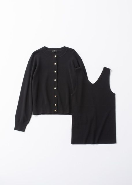 UVカットレーヨンブレンドメタルボタンカーディガン¥6,990 UVカットレーヨンブレンド2WAYニットタンクトップ¥4,990(ともにPLST)