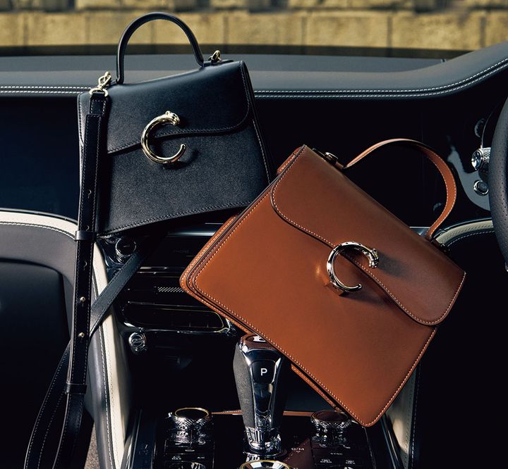 右下、バッグ「パンテール ドゥ カルティエ」スモール 〈H18×W21×D9㎝〉¥544,500 左上、バッグ「パンテール ドゥ カルティエ」ミニ 〈H15×W18.5×D8㎝〉¥484,000(ともにカルティエ/カルティエ カスタマー サービスセンター)