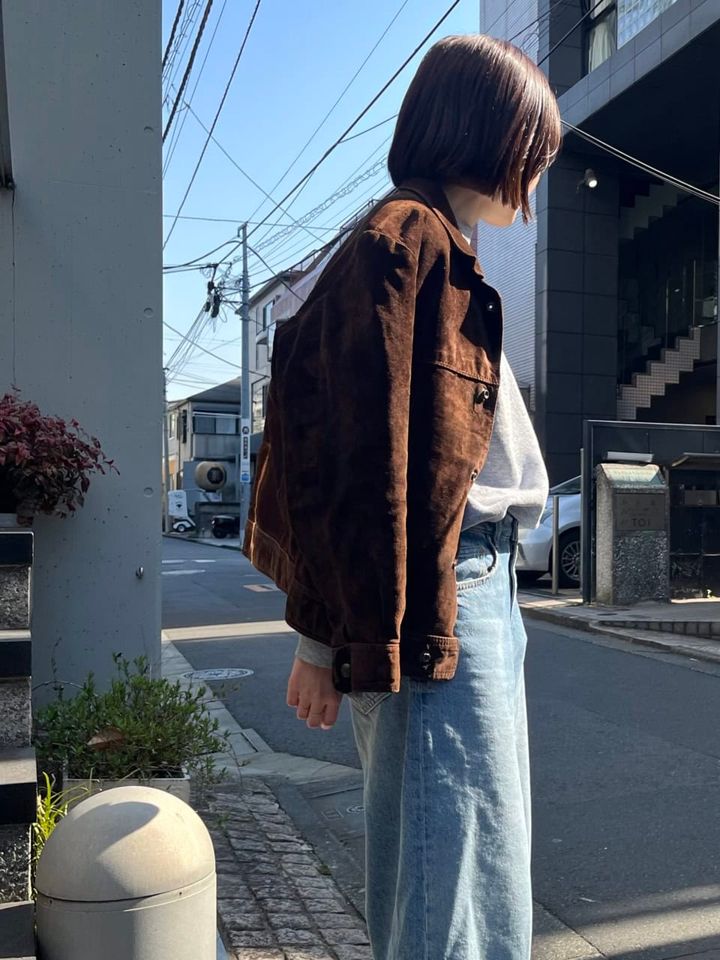 「ヴィンテージショップで購入したスエードジャケットは、トレンドのブラウンカラーがお気に入りの一枚。ショート丈のパンツを合わせ、春らしい軽い印象に仕上げました。トップスをスエットにすることで、ジャケットやブーツのカチッとした素材感をラフに落とし込んでいます」