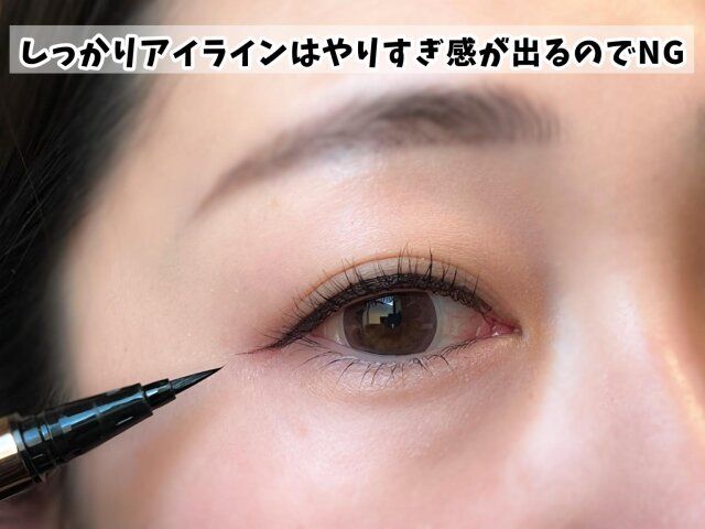 目頭から眉尻までしっかり太くアイラインを描いている人はNG。逆に目が小さく見えてしまったり時代遅れ感が出やすくなってしまいます。