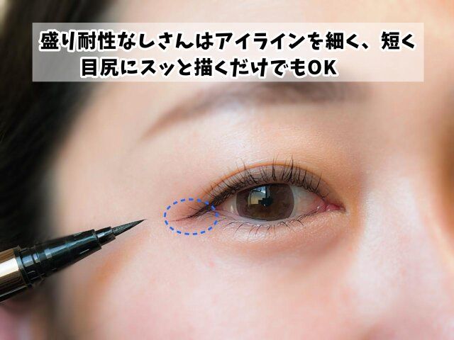 盛り耐性なしさんは目尻にスッと入れるだけでもOK。ちょっと物足りないな〜と思う人はまつ毛とまつ毛を埋めるように描き足してください。