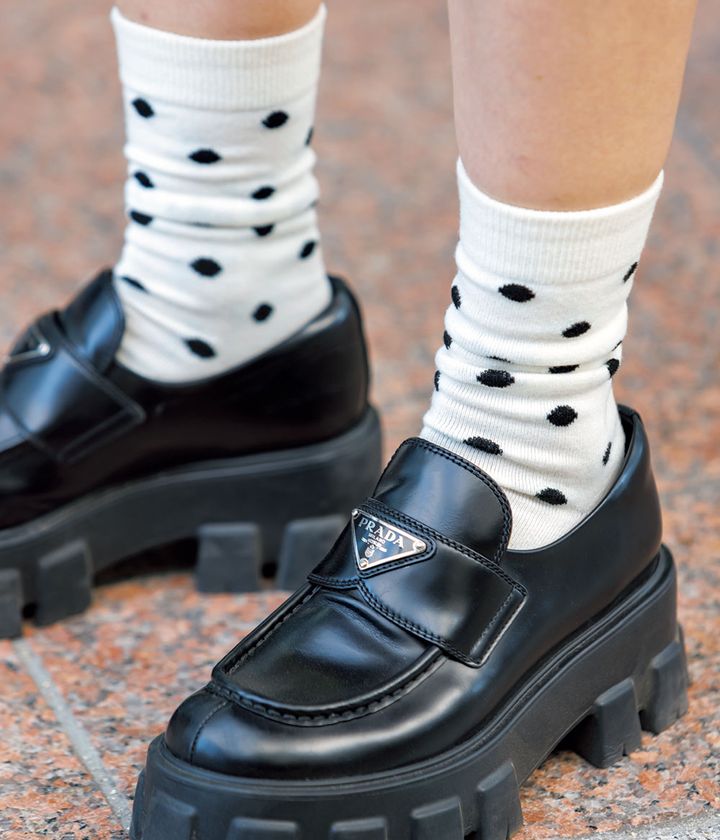 『暗く落ち込みがちなブラックコーデはドットソックスで春らしくポップに。足元が重く見えないよう、白の分量を増やします』