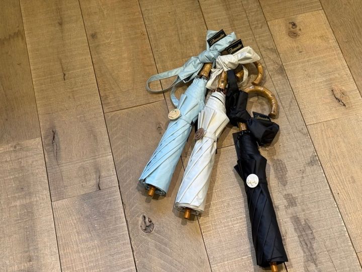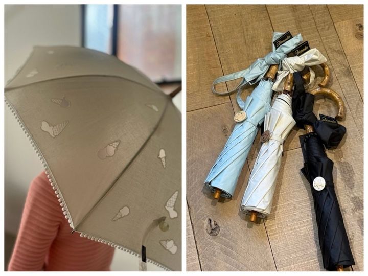 晴雨兼用の折りたたみバージョンは紫外線遮蔽率99.99%の生地を使用。日傘各¥13,200(デモデ)
