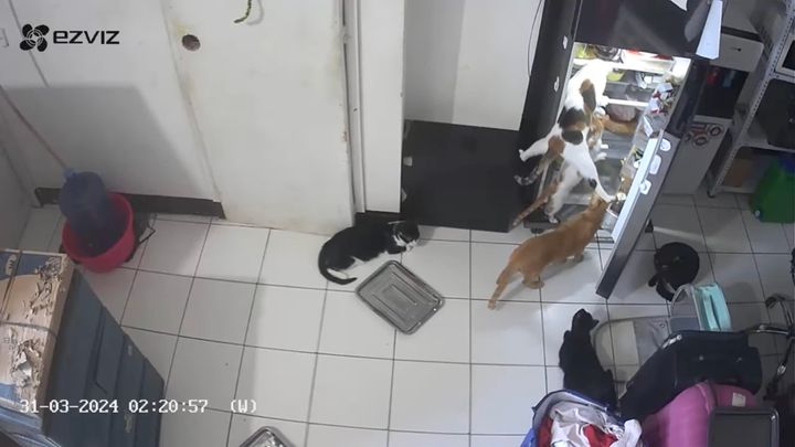 フィリピンはマニラで監視カメラが捉えたのは、とあるお宅での冷蔵庫窃盗犯による大胆な犯行現場であります。見張り役、ドアを開ける役、開いたままにしておく役、中に忍び来む役、平静を装う役など、6匹の猫たちがそれぞれの役割を果たしながら、冷蔵庫に秘められた食べ物をゲットしたのであります。
