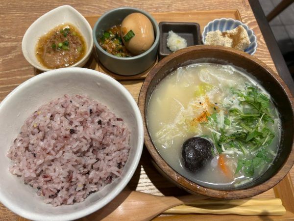 具沢山スープに、その日のおばんざい2品とミニデザートまでつきます。 この日は、ねぎ塩煮込みハンバーグと煮卵、そしてわらび餅でした。 スープには、柚子おろしも添えられ、味変もできます。 これは贅沢!