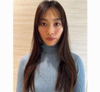前髪は深めに薄く、繋がるように厚めに作ったサイドバングでこめかみの削げをカバー。シアーバングで前髪ありなしどちらもキマる。