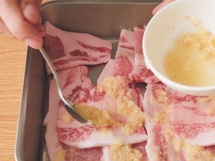 ①豚肉は長さを半分に切る。片面に下味の材料を混ぜて塗り、5分ほどおく。