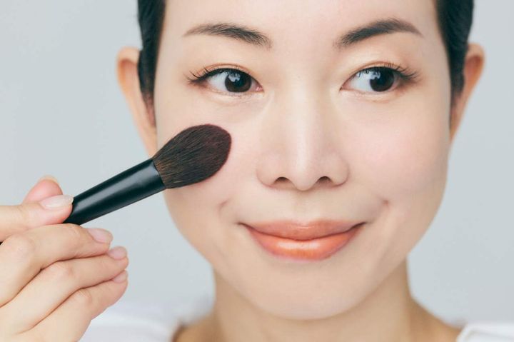 ①明るめのチーク(使用アイテムE)を広めにふんわりとのせます。