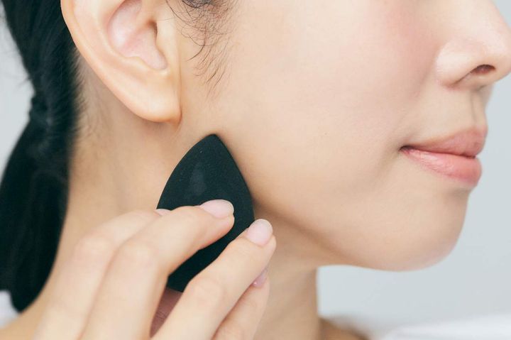 ②自分の肌色より少し濃い目のファンデーション(使用アイテムD)でフェイスラインから首までシェーディンクを。小顔効果はもちろん、写真を撮るときに顔と首の色が違ってしまうのを防ぎます。