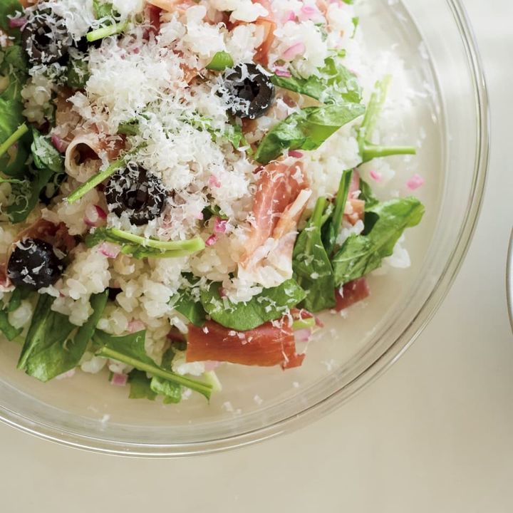 程よく酸味がきいた酢飯は、どんな具材ともおいしくまとまる万能さが魅力。意外と簡単に作れて栄養を一皿で摂れるので、ぜひお試しを! 酢飯に華やかな食材をのせれば“おもてなし”や“お祝い”の料理として重宝し、好きな食材を混ぜ込めば“普段”の料理として役立ちますよ。今回は、家飲みのおつまみに、火を使わずサクッと作れる『生ハム、オリーブ、ルッコラの混ぜ寿司』をご紹介。玉ねぎやルッコラの爽やかでほろ苦いアクセントが効いて、お酒も進む大人のレシピに。