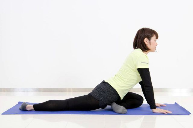 (1)床に四つん這いになって片脚をひざを曲げたまま前に出し、後ろ側の脚はひざを真っ直ぐ伸ばす