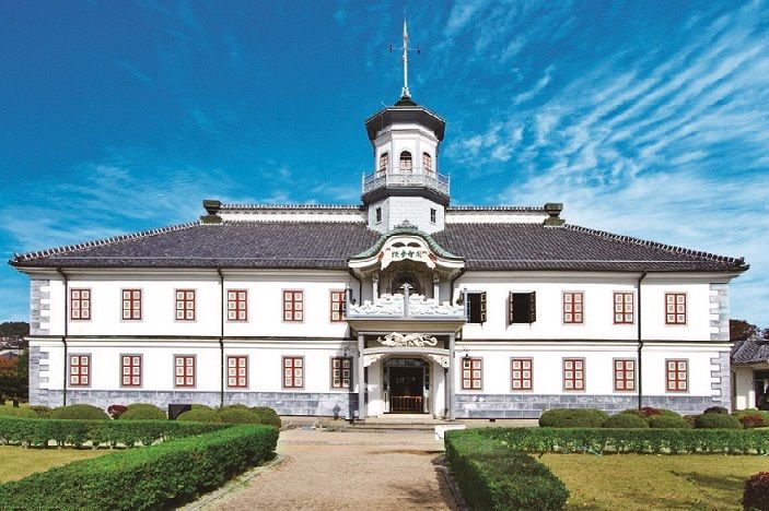 「国宝 旧開智学校校舎(こくほうきゅうかいちがっこうこうしゃ)」は、明治9年(1876)完成の擬洋風建築の代表とされる建物で、2019年に国宝に指定されました。擬洋風建築とは、文明開化を象徴する洋風と和風が混ざり合った建築のこと。外壁に漆喰で石のような模様を施すなど独自の意匠を随所に見ることができます。