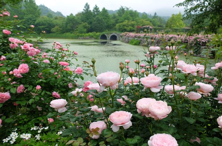 南軽井沢に位置する「軽井沢レイクガーデン(かるいざわれいくがーでん)」は、湖を中心に8つのエリアからなる広大なナチュラルガーデンです。イングリッシュローズ、フレンチローズを中心に植栽されたバラは、なんと約400種類。6月中旬~7月上旬の「ローズシーズン」は、色とりどりに咲き誇るバラが庭園の主役に。うっとりするような華やかな香りが漂います。
