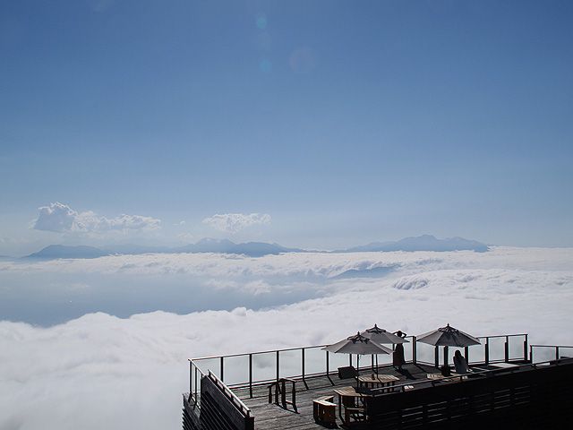 世界最大級のロープウェイで向かう標高1770mのエリアに立つ絶景テラス「SORA terrace(そら てらす)」。急斜面に建てられたテラスからは、長野市、小布施町、中野市に飯山市、木島平村などを一望。条件が揃えば眼下に雲海が広がる、幻想的な世界が堪能できます。