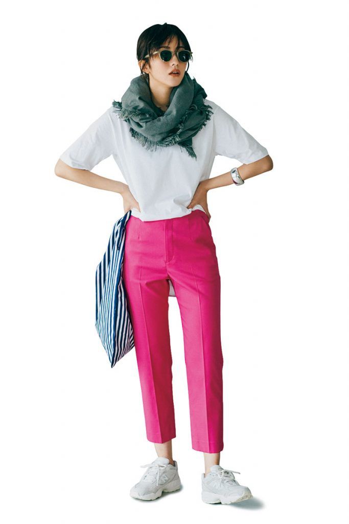 スニーカー¥12,980(ニューバランス/エミ ニュウマン新宿店)Tシャツ¥13,200(ADAWAS/ショールーム セッション)パンツ¥18,700(ユナイテッドアローズ/ユナイテッドアローズ有楽町店)ストール¥39,600(アソース メレ/エストネーション)バッグ¥7,590(ホリングワース カントリーアウトフィッターズ/ザ ストア バイシー代官山店)サングラス¥57,200(アイヴァン 7285/アイヴァン 7285トウキョウ)バングル¥12,650(ファシアータ/フォーティーン ショールーム)