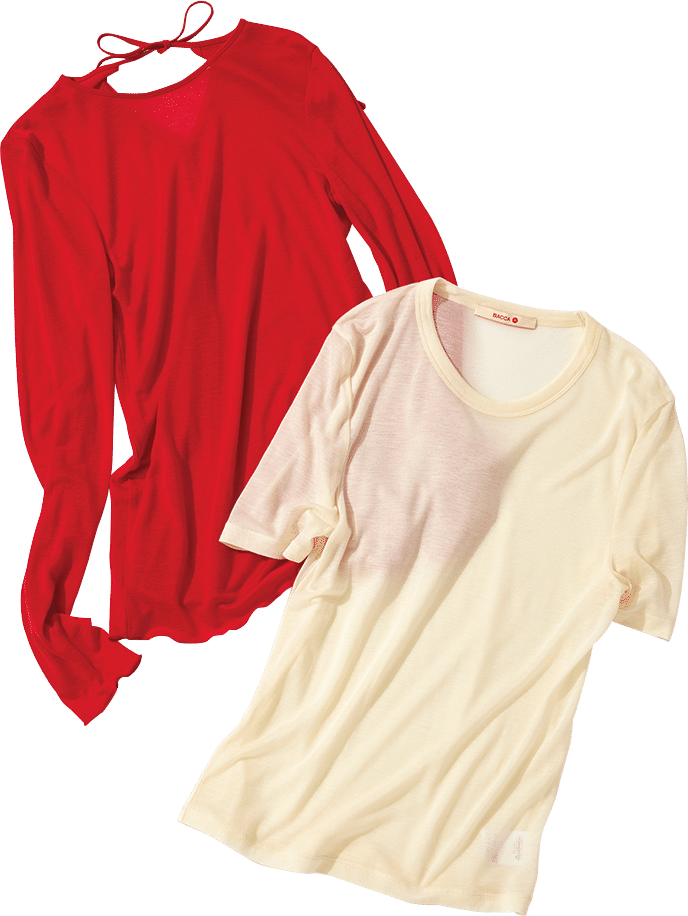 右から:シアーカットソー¥13,200、ロングカットソー¥17,600(共にバッカ/ビー エディション ニュウマン新宿店)