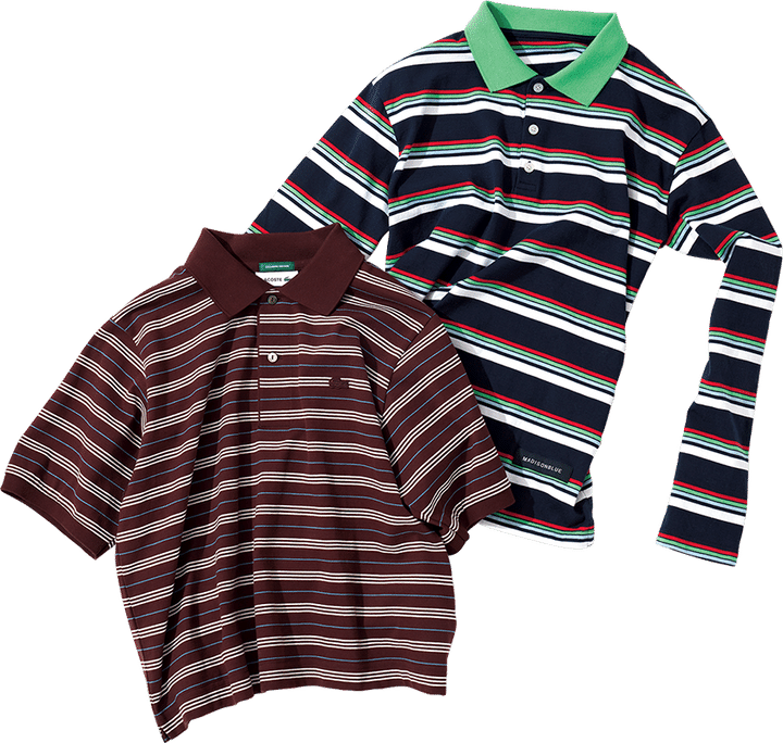 右から:ロングポロシャツ¥72,600(マディソンブルー/マディソンブルー トーキョー)、ポロシャツ※別注¥20,900(ラコステ フォー アダム エ ロペ/アダム エ ロペ)