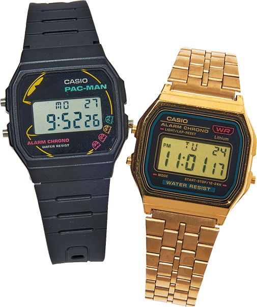 右から:ゴールド時計¥7,150、黒時計¥7,700(共にカシオ クラシック/カシオ計算機 お客様相談室)