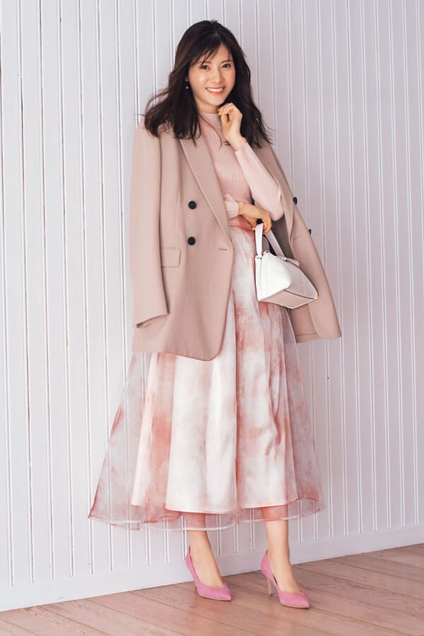 3. 全身ピンクでもくどくない!チュールSNとジャケットで作る大人のニュアンスピンクコーデ