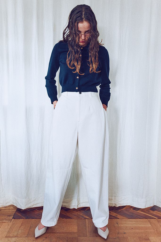 クリーンな配色も引き立つ「きゅっと締まったウエストフォルム」。通常よりも高めのウエスト位置にくびれの出るハイウエストで脚も長く見える設計。パンツの丸みと、すそがすぼまったニットの相乗効果でベルトなしでもメリハリよく。 白デニムパンツ/ダブルスタンダードクロージング(フィルム)