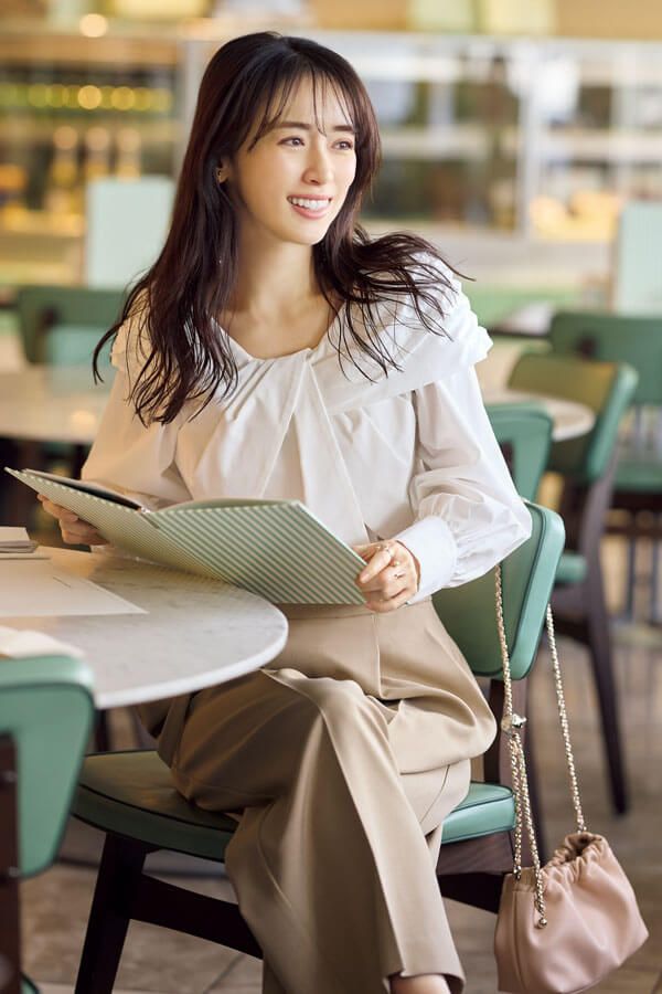 初対面からいきなり壁を作らないよう、清楚感あるベーシックコーデで。ひとさじの華感が〝自慢の彼女〟になる秘訣! リボンライクなフォルムが華やかな白ブラウスを、×ベージュパンツで気取らないクリーンなルックに。