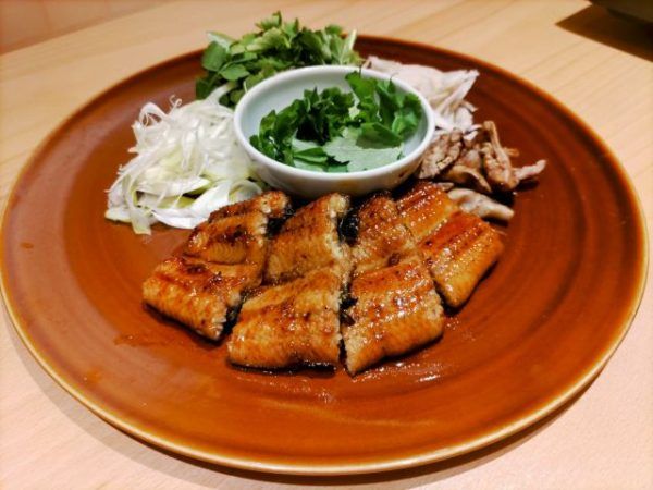 お皿に盛られた具材は、大きな肉厚の鰻が四貫と、肝、ごぼう、せり、水菜など。