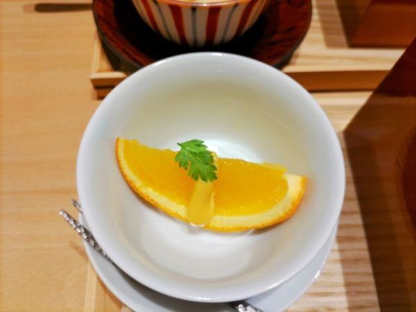「フルーツ」もついてます。この日は、カットオレンジにひと手間かけて、オレンジカスタードのせ。これがまた美味!あと、漬物もついて終了。