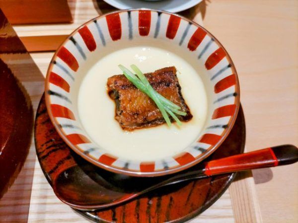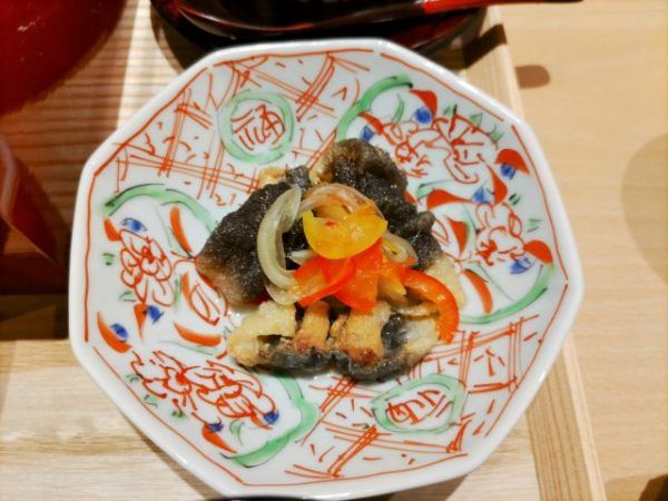 この日の「小鉢」は、珍しい「兜の南蛮漬け」。鰻の頭の部分の肉を南蛮漬けにしたお料理です。初めていただきましたが、もちもちプリプリで柔らかく、サッパリしていて食べやすい。またもや、新しい鰻の魅力発見です。