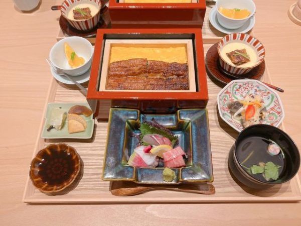 こちらの御膳は、鰻四貫、せいろご飯、だし巻き一本、刺身三種、漬物、茶碗蒸し、小鉢、汁物、フルーツという大満足の内容です。