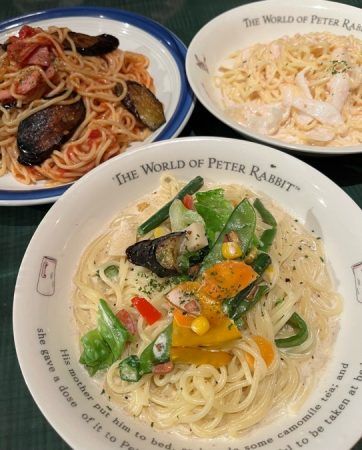 注文した品は、「ベーコンとナスのトマトソースパスタ」と「イカとたらこのパスタ」と「季節野菜のクリームソースパスタ」