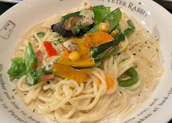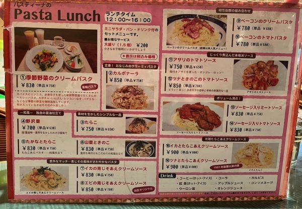 麺はもっちもちでしっかりソースの味が絡んでいます。 野菜はキャベツ、オクラ、インゲン、アスパラ、タケノコ、コーン、カボチャ、にんじん、ナス、パプリカと、本当に季節の野菜がたっぷり! ちゃんぽんの具を思わせる量ですが、クリームソースととってもマッチしています。 ほとんどのパスタは1000円未満で、セットでサラダ+ドリンク(430円)かサラダ+グラスワイン(450円)が選べます。