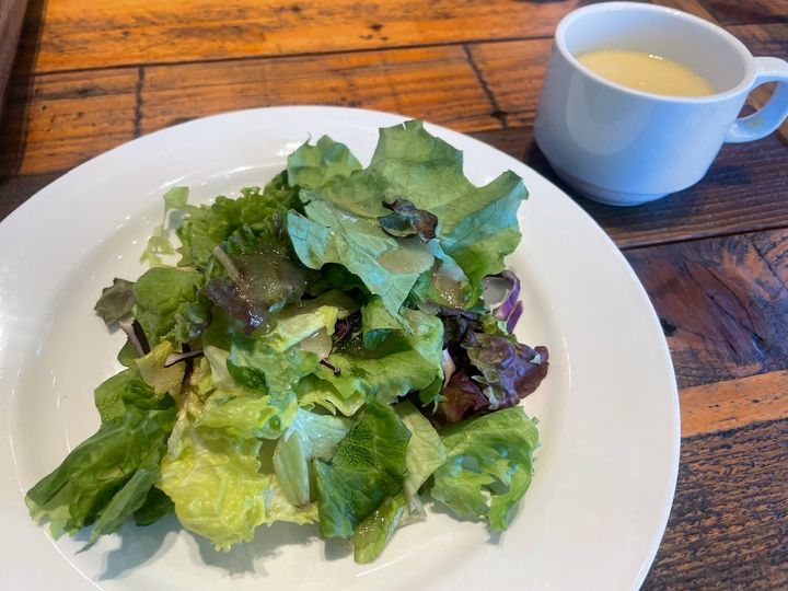 前菜にサラダとスープがついてきました。 こちらはすぐ出てくるので、パスタを待つ間にペロリ。