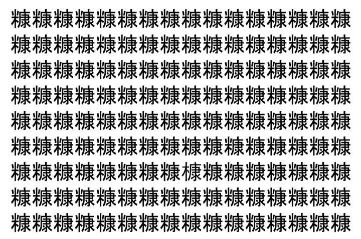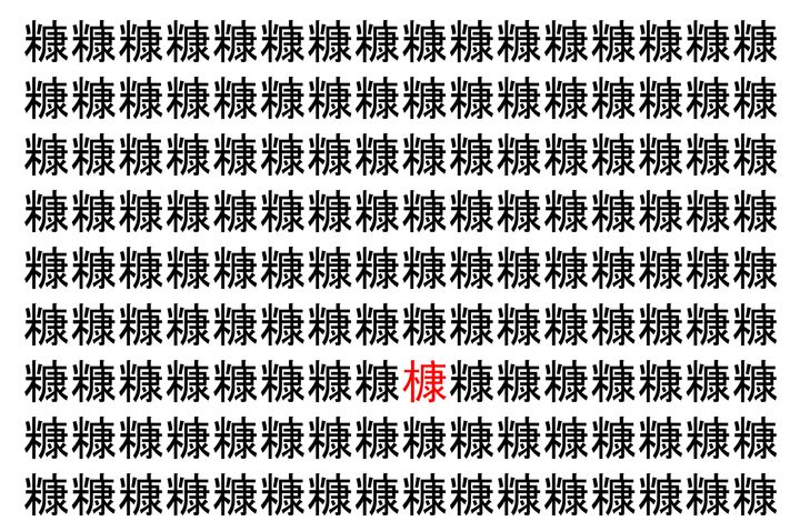 画像の中には、「糠」という漢字が縦に9行、横に16個並んでいます。 全部で144個となりますが・・・、そのうち1つは「異なる漢字」となってますよ!!