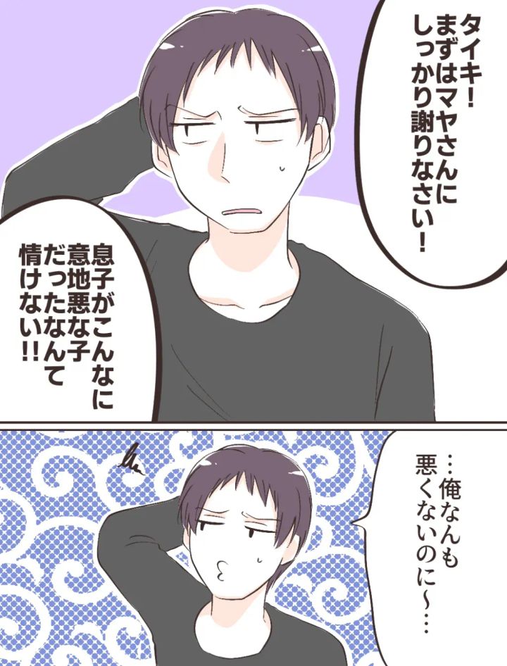 「タイキ!まずはマヤさんにしっかり謝りなさい!息子がこんなに意地悪な子だったなんて情けない!!」そう言うと、「・・俺なんも悪くないのに~・・」と納得いかない様子のタイキさん。