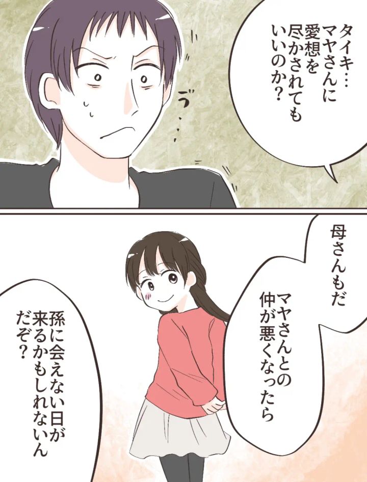 「タイキ・・マヤさんに愛想を尽かされてもいいのか?」義父にそう言われたタイキさんは「う゛・・」と言葉に詰まります。そして「母さんもだ。マヤさんとの仲が悪くなったら、孫に会えない日が来るかもしれないんだぞ?」義父が義母にそう言いました。