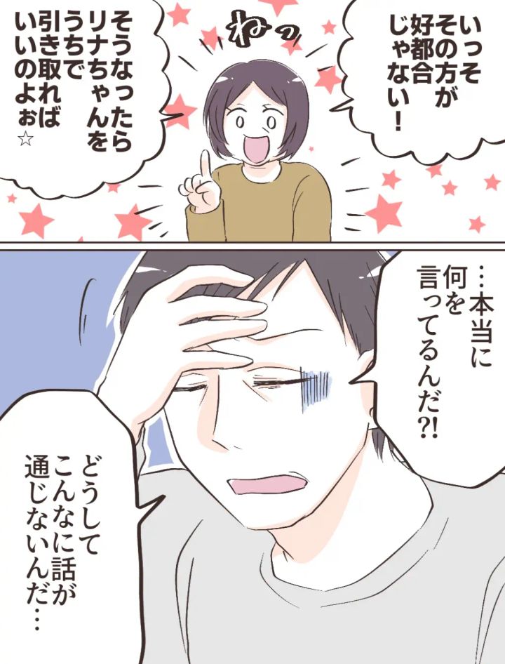 すると、「いっそその方が好都合じゃない!ねっ!そうなったらリナちゃんをうちで引き取ればいいのよぉ」と能天気に答える義母に、「はぁ・・本当に何を言ってるんだ!?どうしてこんなに話が通じないんだ・・」と呆れかえる義父は、