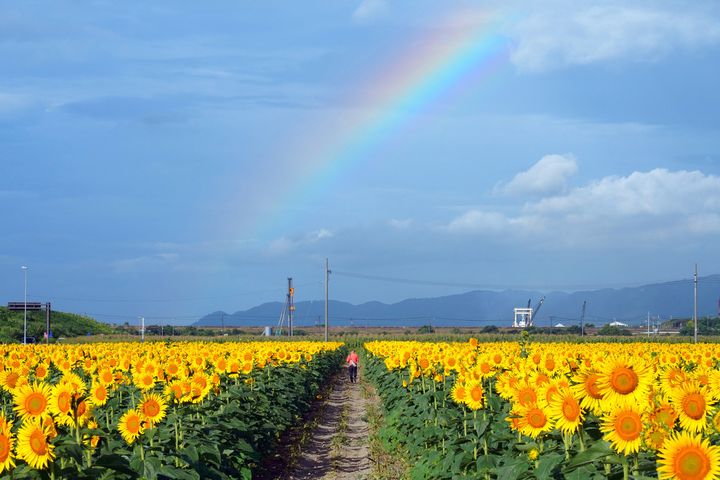 4ヘクタールの畑に、春は約1,000万本の菜の花とポピー、夏は100万本のひまわり、秋は風にゆれる3,000万本のコスモス……と、広大な畑に季節の花々が咲き誇ります。