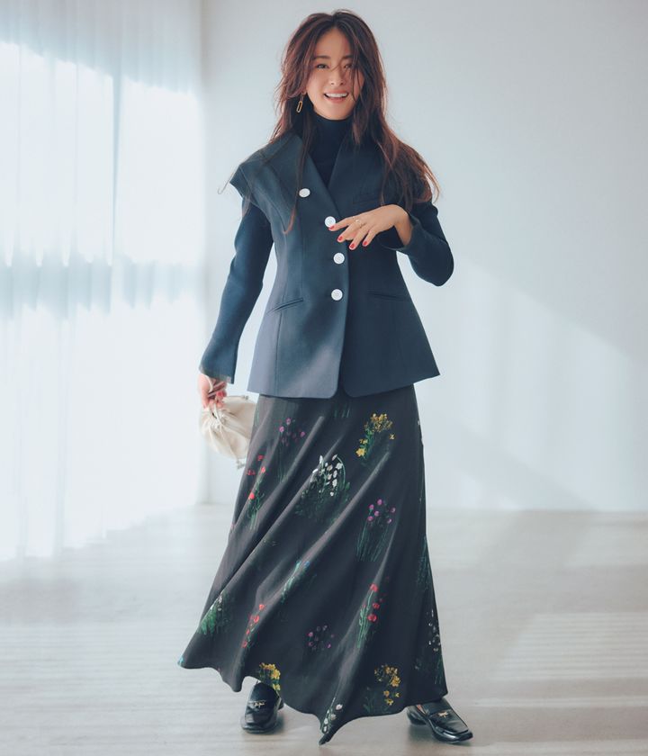 ジレ¥79,200花柄スカート¥75,900ローファー¥56,100(すべてアキラナカ/ハルミ ショールーム)ニット¥35,200(アドーア)バッグ¥110,000(J&M デヴィッドソン/J&M デヴィッドソン カスタマーセンター)ピアス¥39,600(ブランイリス/ブランイリス トーキョー)リング[中指]¥13,200(YArKA/ロードス)リング[人さし指]¥3,960(フル・オブ・グレイス/ズットホリック)