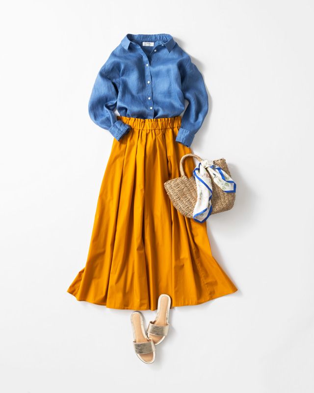 プレミアムリネンシャツ¥2,990 カゴバッグに結んだシルクスカーフ¥1,500 (ともにUNIQLO) タックギャザーフレアロングスカート※一部店舗のみ ¥1,990 (GU) カゴバッグ¥3,400 (マリー・ルイーズ/ラヤン) フラットサンダル¥13,200 (W&M/インドル)
