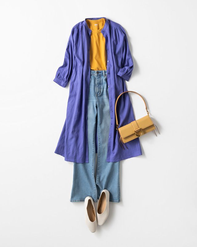 カラーワンピースとデニムをブルーで合わせ、インナーにイエローをきかせた2色コーデ。ワンピースのフロントを開けるだけで、新しい着こなしに出会えます。手持ちのデニムにでも合わせやすい変化をつけて。