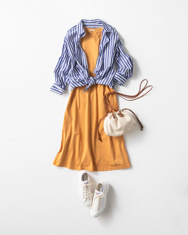 すとんと落ち感のあるワンピースには、体の泳ぐオーバーシャツ合わせなら変化がつきやすい。ワンマイルコーデとしても活躍してくれるはず。1枚あると変化がつけやすいシャツは、ウエストマークしてアレンジの幅を広げて。
