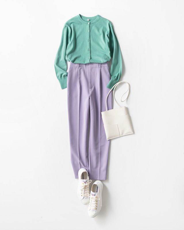 キレイ色配色パンツコーデ4.「パープル&グリーン」