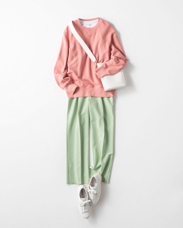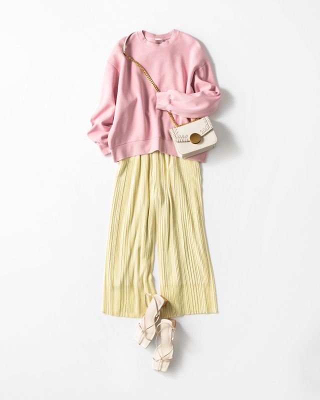 夏になれば肩掛けして色を重ねられる、肉厚なパステルピンクのスウェットには、シフォン素材のスカートパンツで素材に変化をつけて。