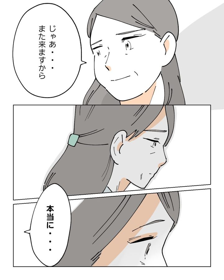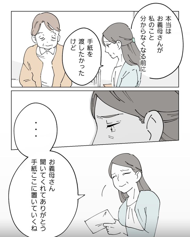 そして、「本当は、お義母さんが私のこと分からなくなる前に、手紙を渡したかったけど・・」そう呟いた後で、「・・お義母さん、聞いてくれてありがとう。手紙ここに置いていくね」と声をかけました。