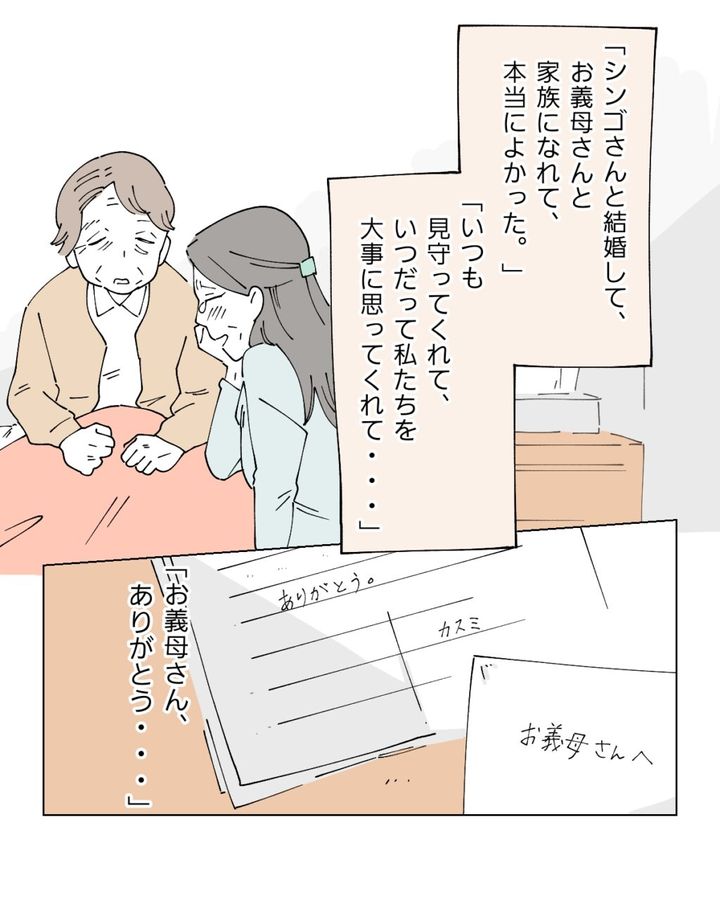 「シンゴさんと結婚して、お義母さんと家族になれて、本当によかった。いつも見守ってくれて、いつだって私たちを大事に思ってくれて・・お義母さん、ありがとう・・・」