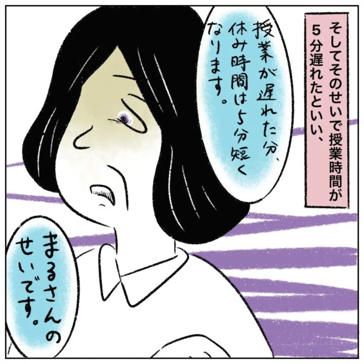 そして、そのせいで授業時間が5分遅れたといい、「授業が遅れた分、休み時間は5分短くなります。まるさんのせいです」と言い出す性根先生。
