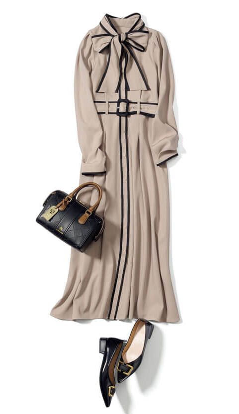 ワンピース¥23,100/CELFORD バッグ¥8,800/オリエンタルトラフィック(ダブルエー) バッグに巻いたスカーフ¥1,100/神戸レタス ローファー¥26,400/銀座かねまつ(銀座かねまつ6丁目本店)