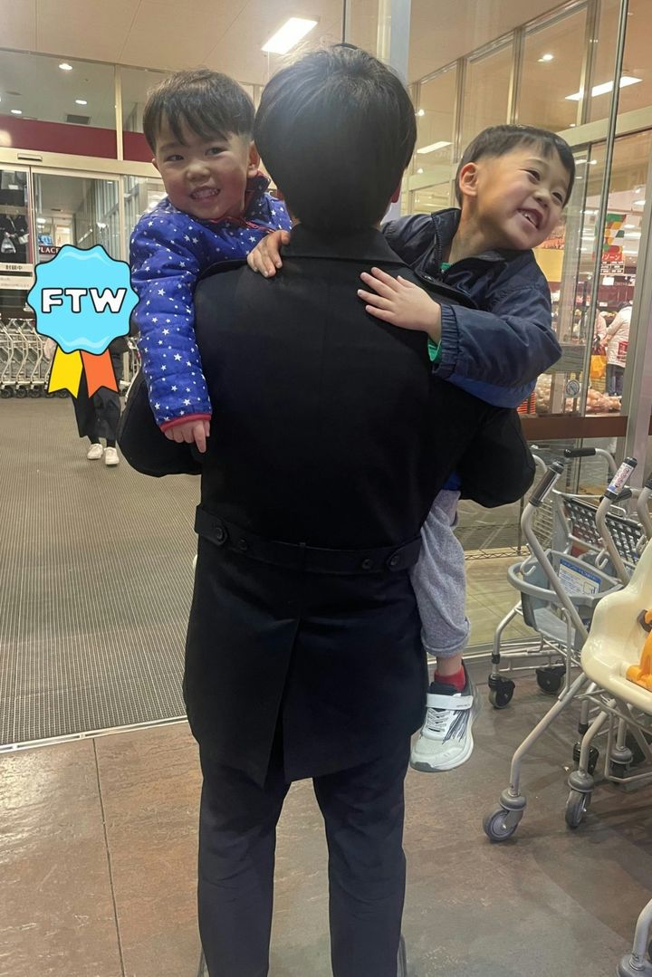残業で帰りが遅いパパを心待ちにしていた子どもたち。買い物先にパパがいたときは、さぞ驚いたでしょうね。5歳と3歳の息子さんたちのかわいらしい笑顔が輝いていて「パパ大好き!」という気持ちがあふれ出ています。背中を向けているパパの笑顔も想像できますよね。